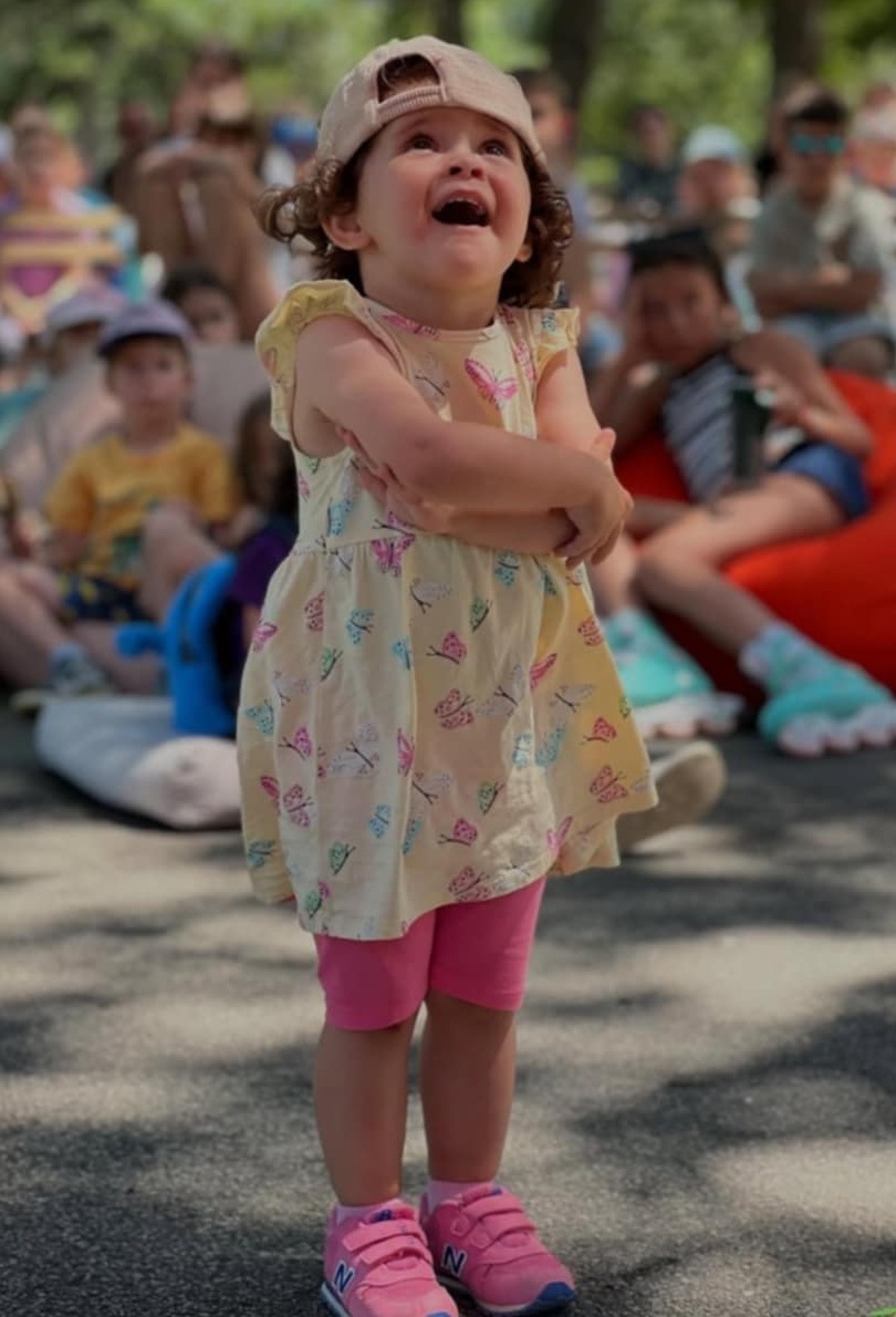 2-годишната Луиза сега усвоява сложните думи в българския език и се упражнява да ги изговаря правилно, а татко й я насърчава.