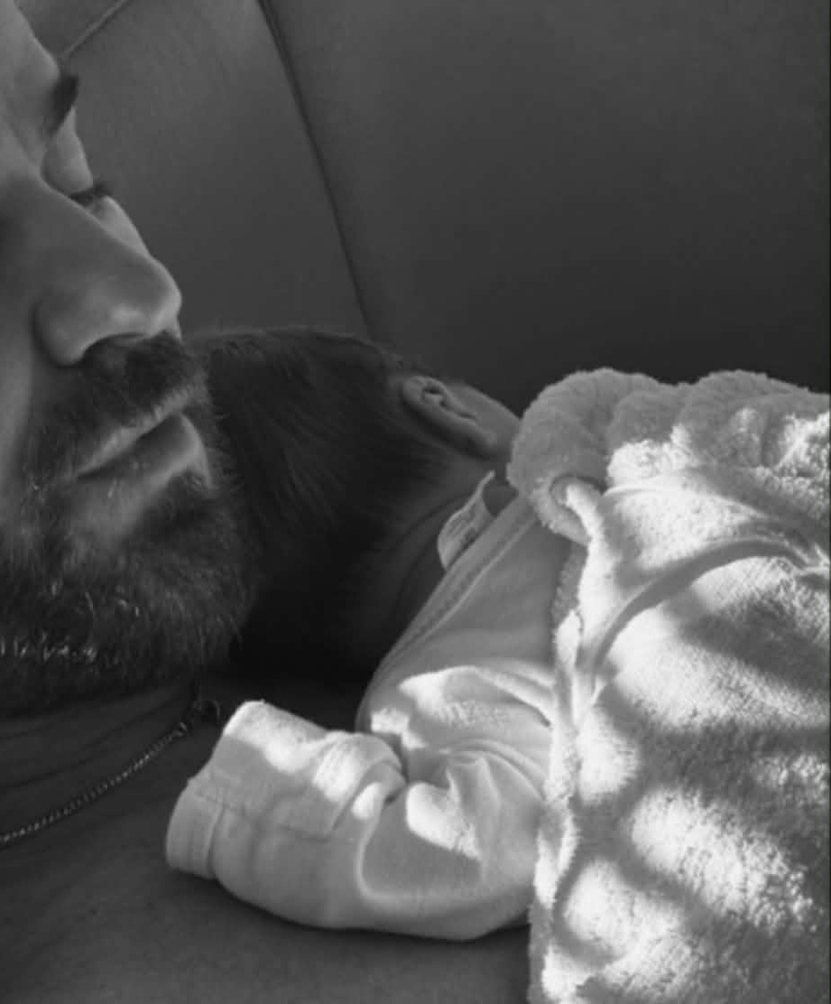 Трогателният черно-бял кадър показва бебето, легнало на гърдите на баща си.