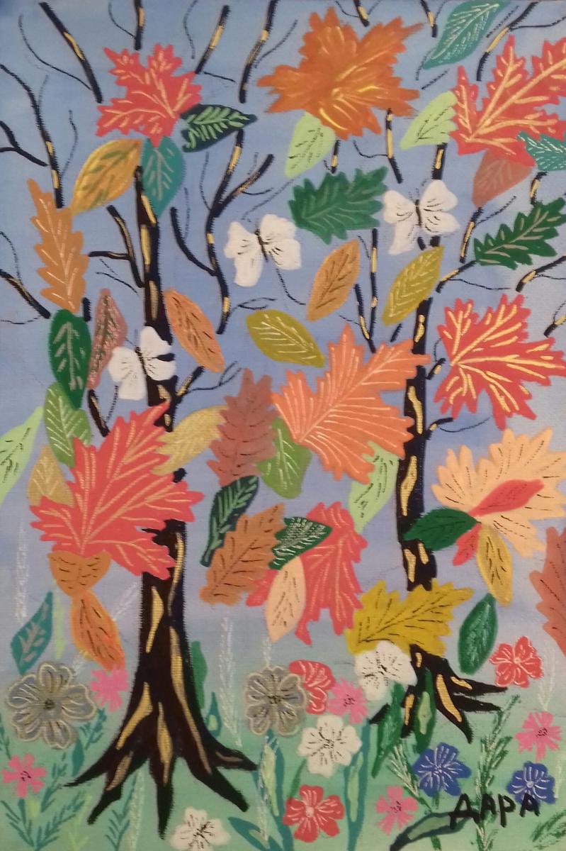Зелени, жълти, червени, кафяви листа ... Есента е обагрила листата на дърветата. Меките тонове в картината на малката Дара ви карат да се усмихнете с носталгия за отминалото лято. Изпълват ви със спокойствие и надежда. Каково по-хубаво от това.