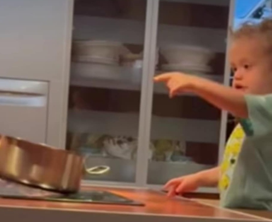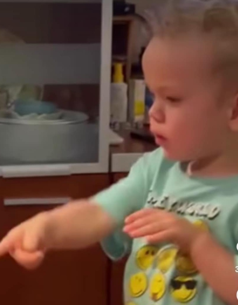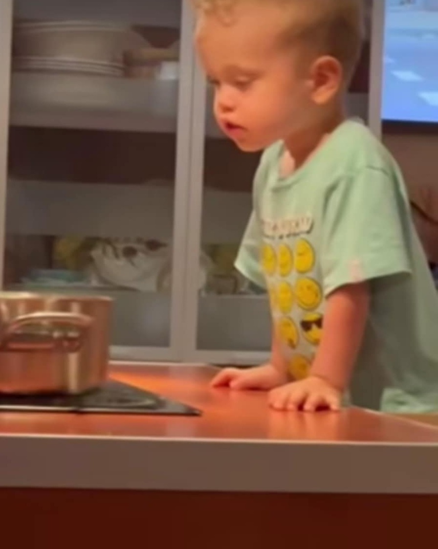 Във видеото мама и татко не се виждат, но зад кадър се чува гласът на Цветин, който предупреждава 2-годишния си син да внимава с печката.