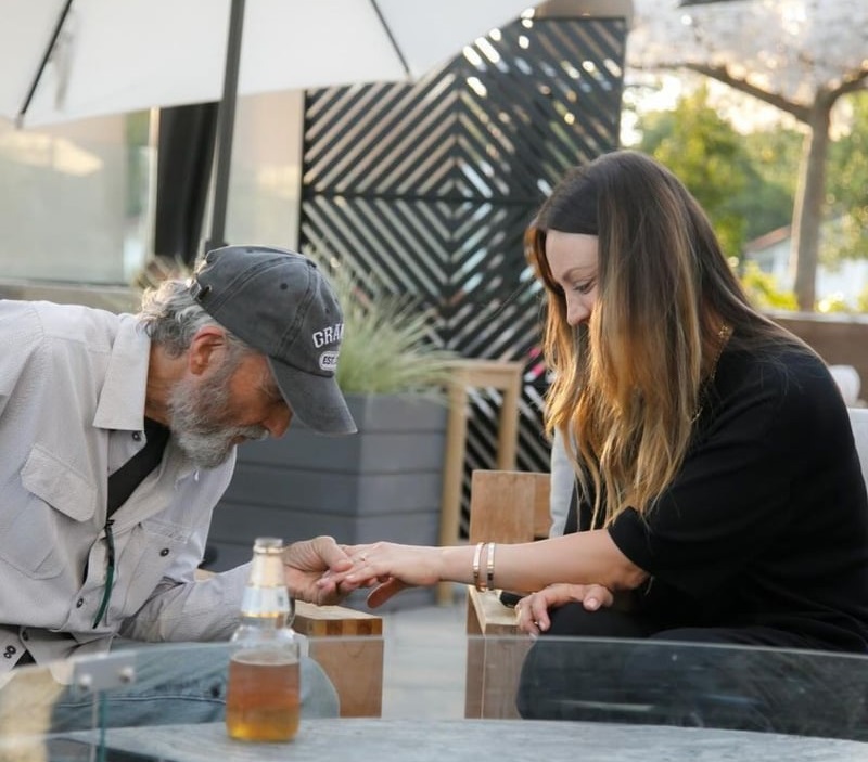 На ръката й се вижда пръстен, който блести, докато гали лицето на Том.