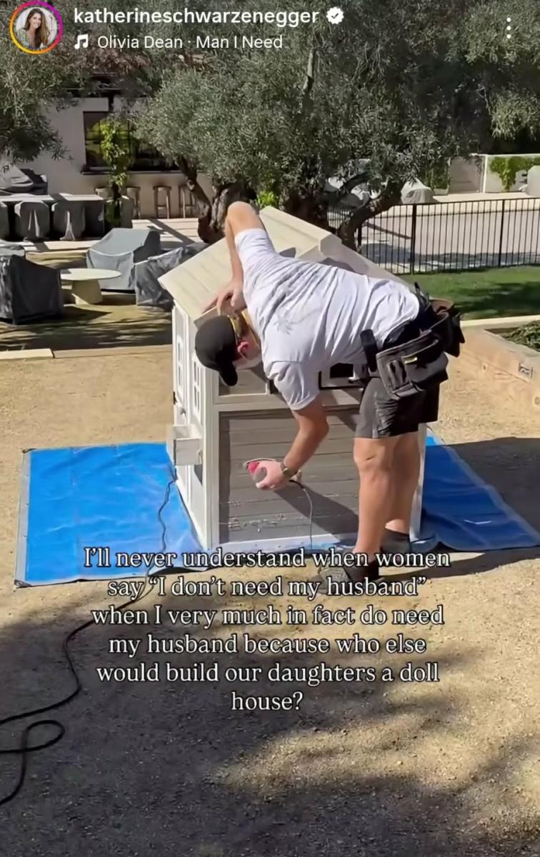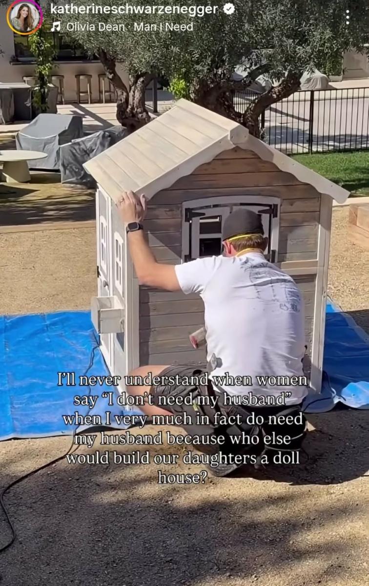 А Катрин не пропусна да го похвали в социалните мрежи. Тя пусна видеоклип, на който 46-годишният Прат шлайфа дървената къщичка, която е с впечатляващи размери.
