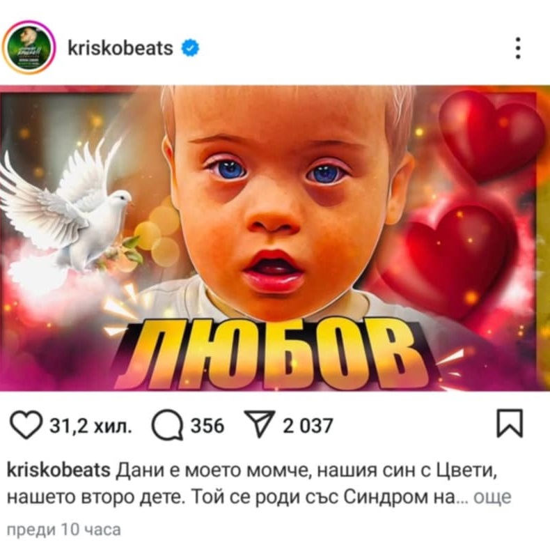 "Дани е моето момче, нашият син с Цвети, нашето второ дете. Той се роди със синдром на Даун и въпреки препятствията, трудностите и предизвикателствата, които имаме и най-вероятно ще имаме и занапред, той е тук, за да се гордеем с него и да го обичаме. Знам, че Дани е тук с много специална мисия и тя вече започна. Първо, той ме накара да гледам по различен начин различните деца и да чувствам потребност да им бъда полезен най-малко с публичното ми влияние“ , написа в социалните мрежи Криско.