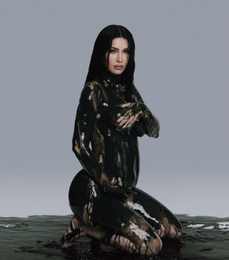 Тя позира с видимо очертан корем, който подсказва че е поне в шестия месец.