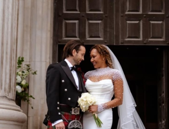 Младоженецът носеше традиционен шотландски килт, а булката застана пред олтара в елегантна бяла рокля тип „русалка“ от английската сватбена марка Josephine Scott. Прозрачното й деколте беше инкрустирано с перли и имаше обемен воал.