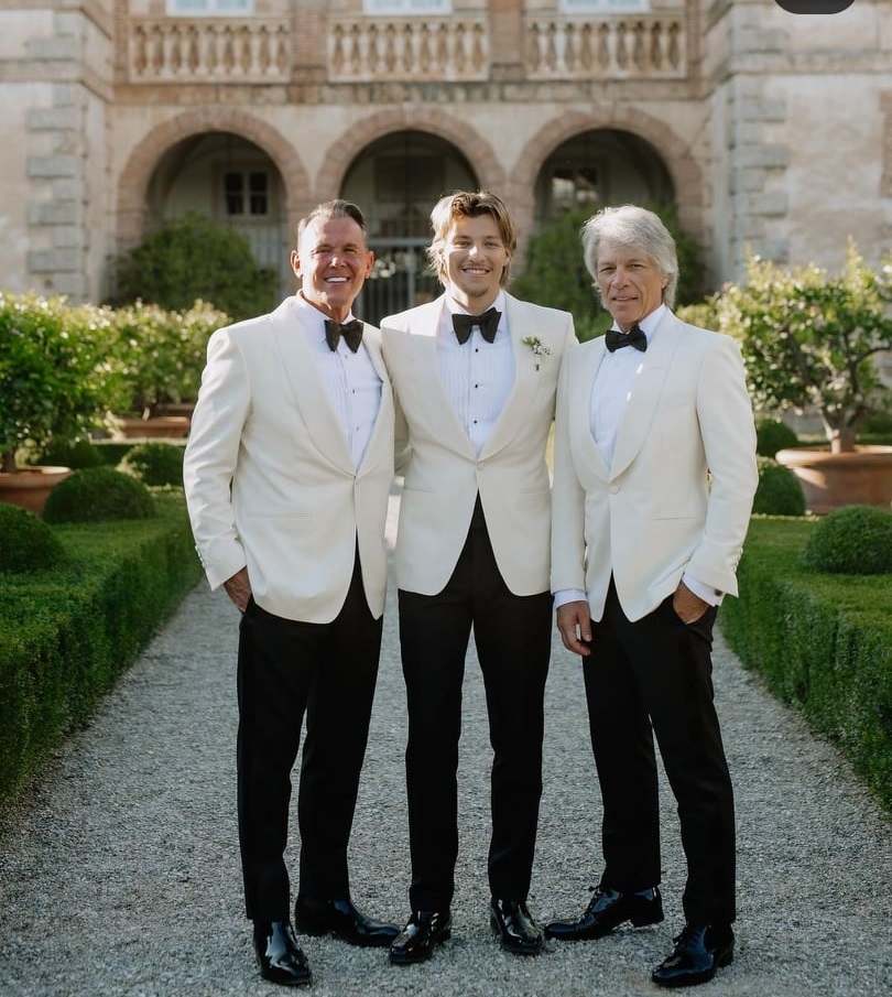 Бон Джоуви изглеждаше суперелегантен в смокинг в цвят слонова кост, който съчета с черни панталони, бяла риза и модерна черна папийонка.