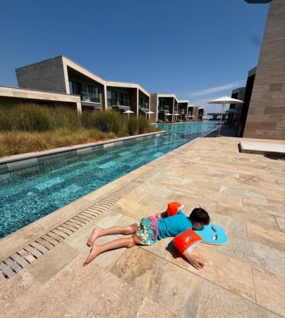 А други кадри показват „уроците по плуване“ на сухо върху плочките на басейна, които взема 5-годишния Никола.