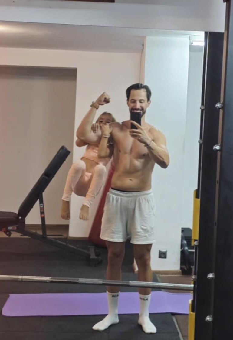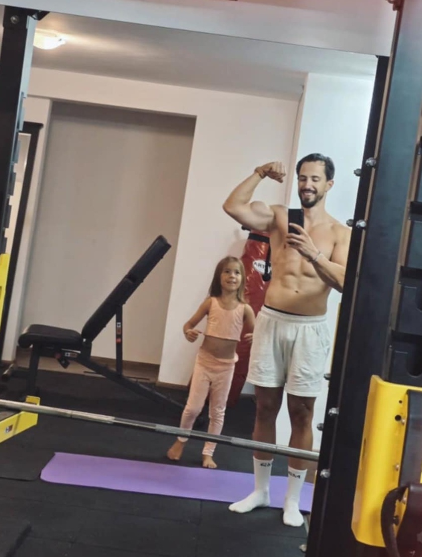Наум тренира в спортната зала, а до него е 5- годишната му дъщеря Амая, която явно следва стъпките на татко и не пропуска тренировка.