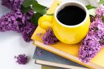 Цъфнал люляк, чаша кафе и книги. Снимка: Shutterstock