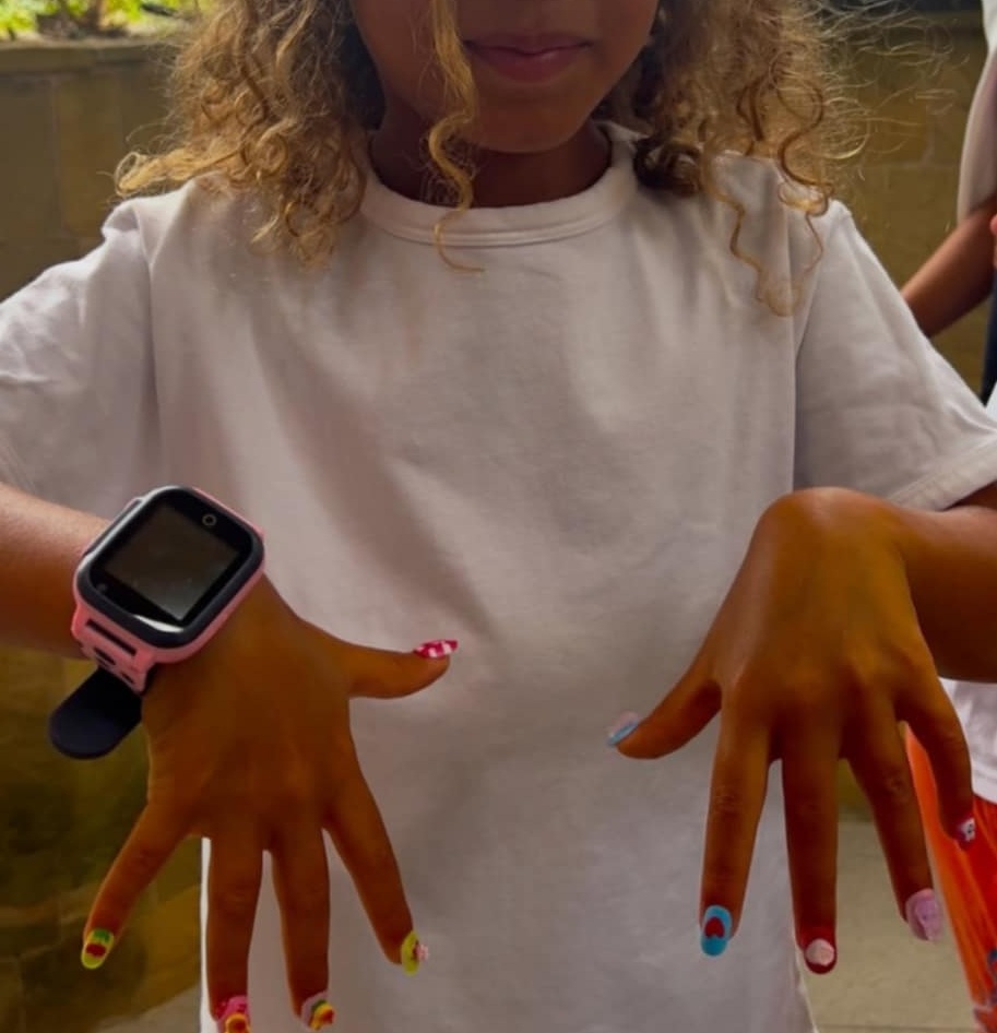 Виждаме и 6-годишната Елизабет с весел маникюр. На всеки пръст лакът е с различен цвят и има весела картинка.