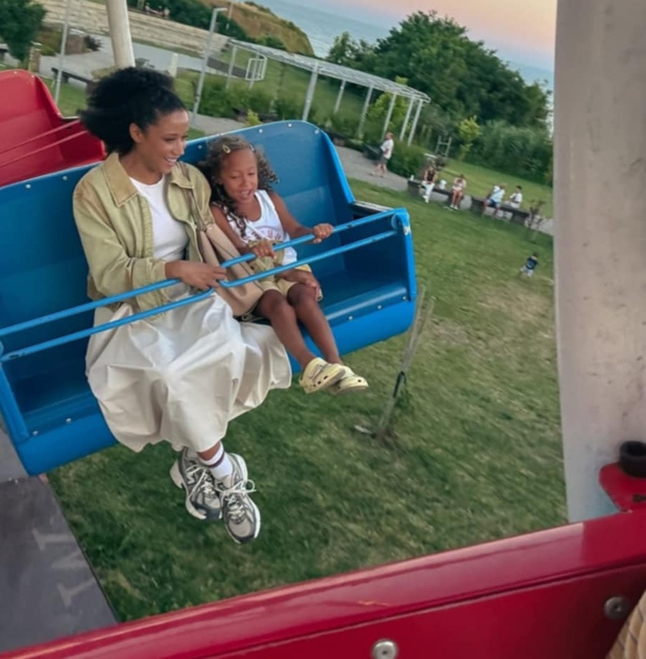 На друг кадър малката Елизабет и майка й Диана Великова са в люлка в увеселителен парк.