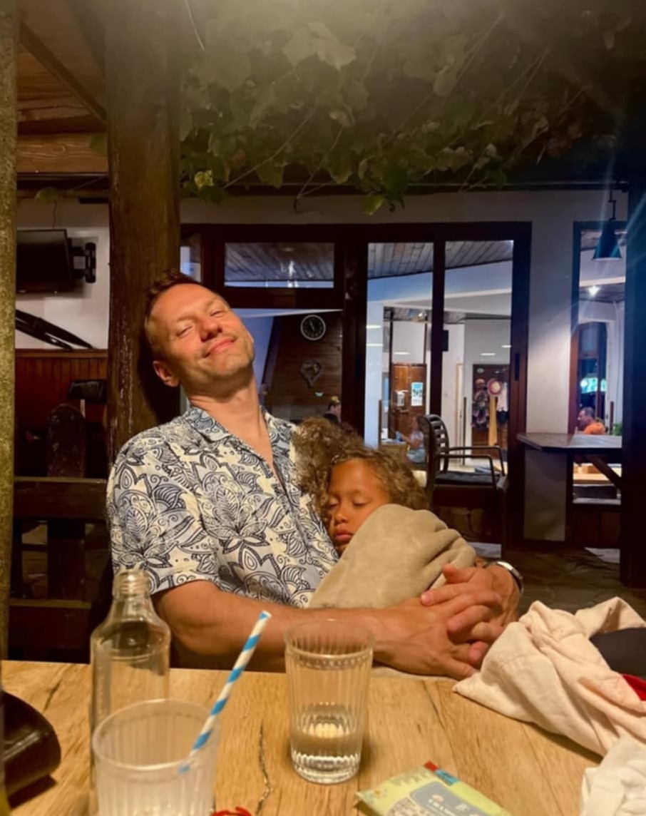 На тях го виждаме как гушка дъщеря си, която е заспала в прегръдките му.