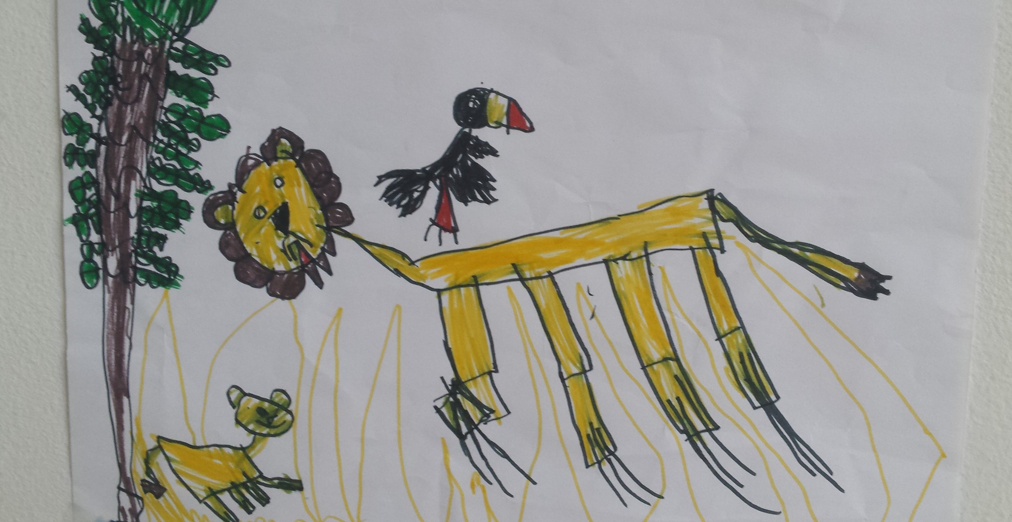 Опитът на Дамян да ни представи назидателния разговор между баща и син, е напълно сполучлив. Ако не вярвате, се вгледайте в детайлите – строгият израз на владетеля на джунглата и внушителните му нокти. А малкият слуша с лукава усмивка, закачливо приклекнал назад. Аха да пропусне урока и да хукне след гарвана.