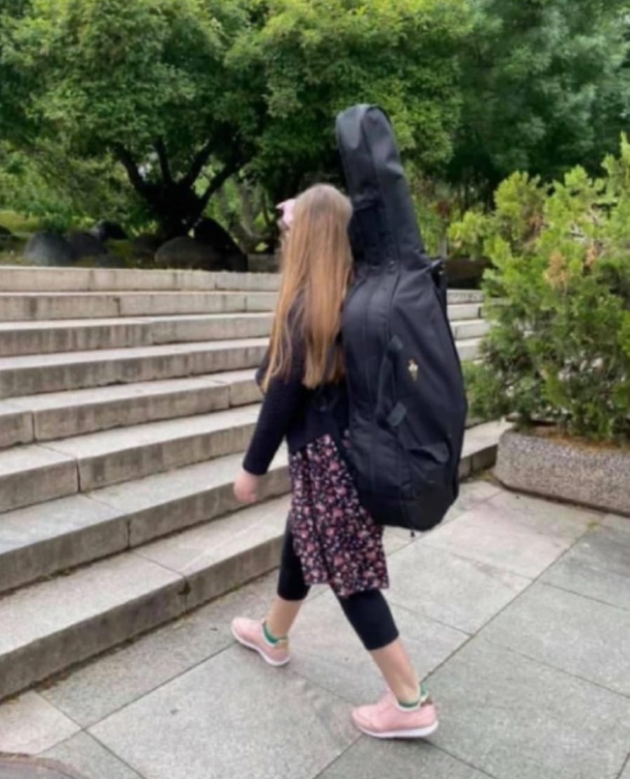 Лидия с виолончелото отива на училище. Снимка: Instagram