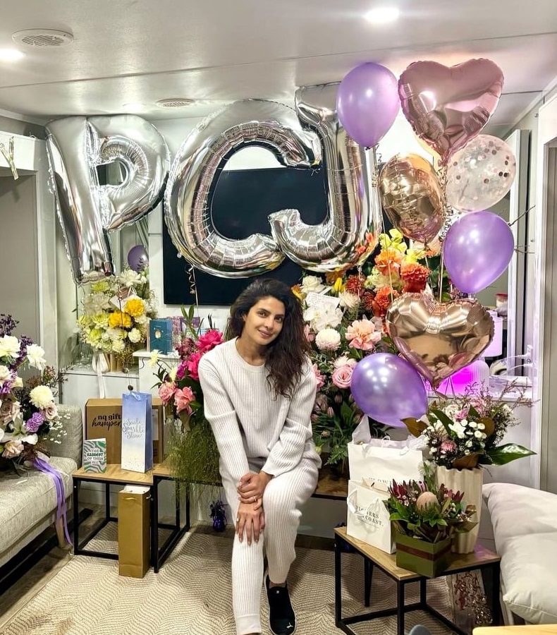 „Тази година имах работен рожден ден, написа Чопра към снимката, позирайки на фона на много цветни букети и балони -. Имала съм толкова много поводи като този през годините и разбрах, че това е един от любимите ми начини да празнувам рождения си ден - да правия това, което обичам на снимачната площадка.”