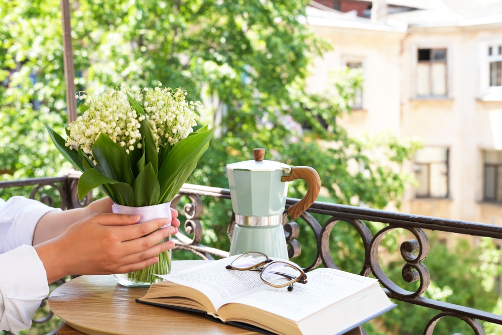 Разтворена книга и букет от момини сълзи на балкона. Снимка: Shutterstock