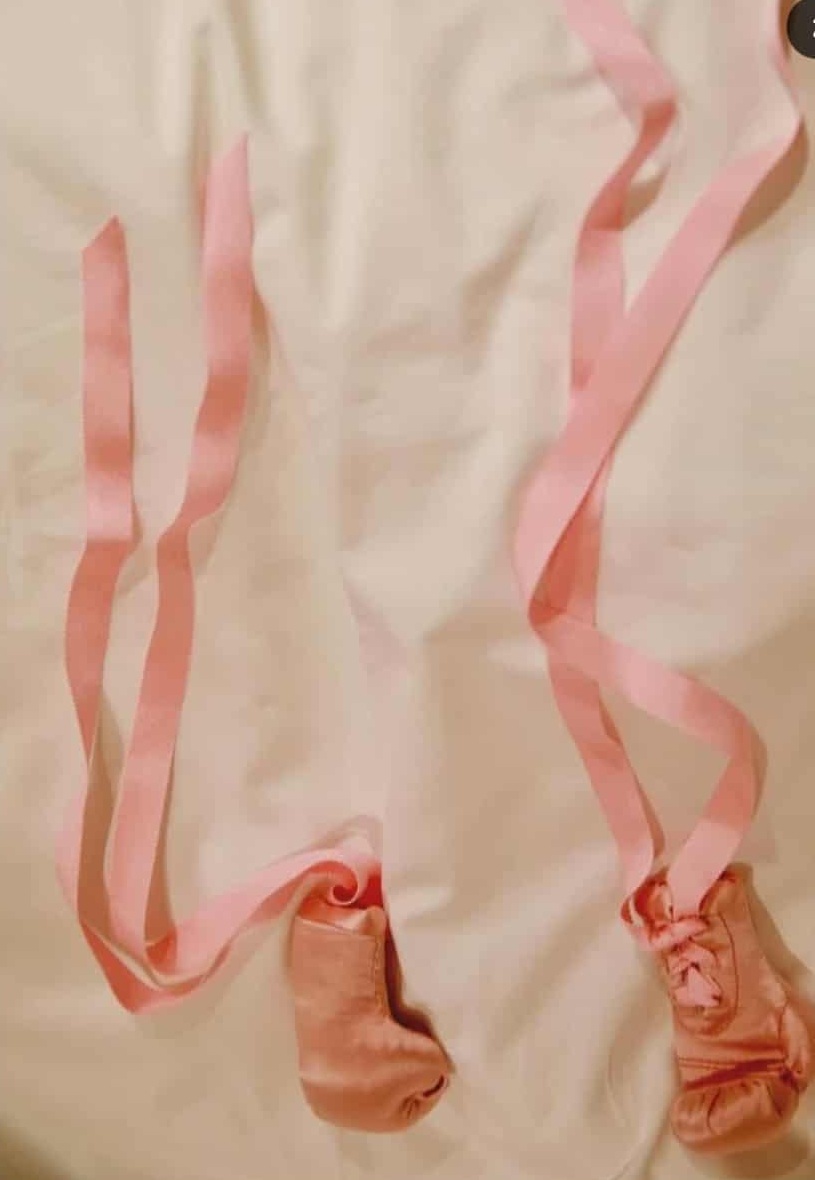 На една от тях държи новороденото , а на другата има миниатюрни бебешки боксови ръкавици, украсени с панделки.