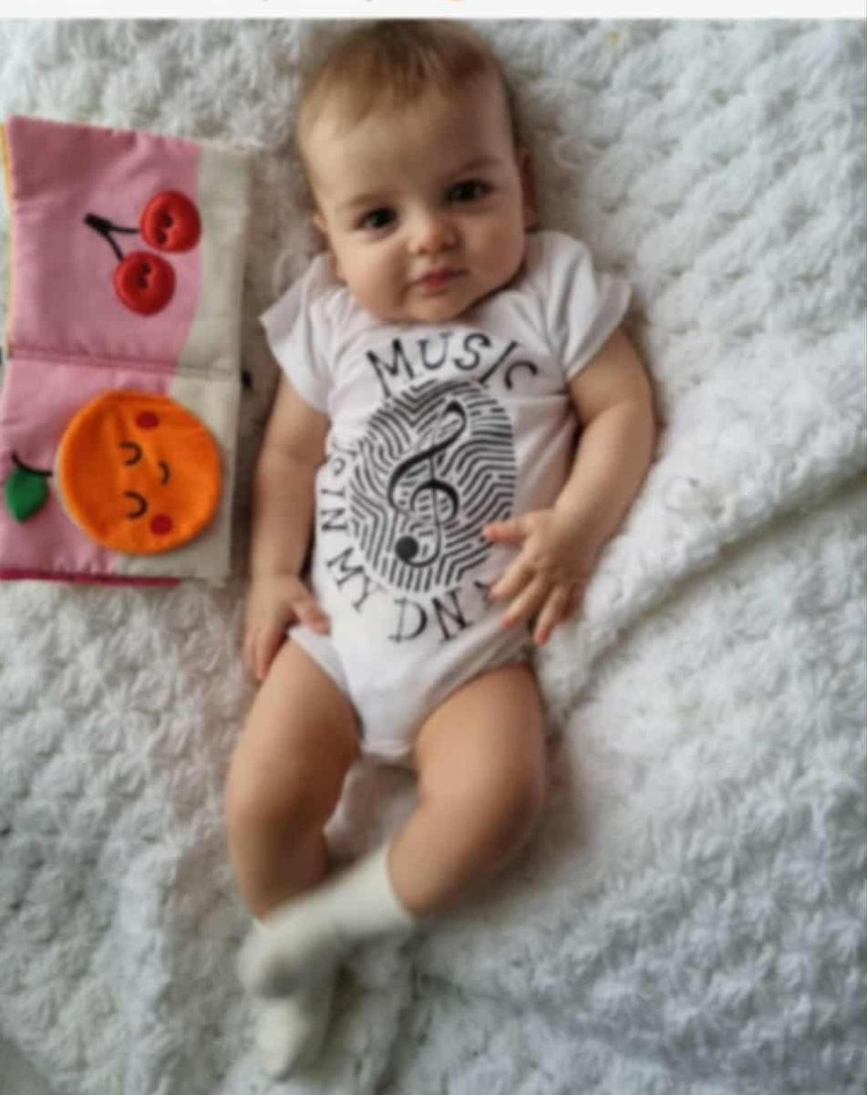 Бебето лежи усмихнато в бяло боди на щампи с ноти и надпис: Music in my DNA.