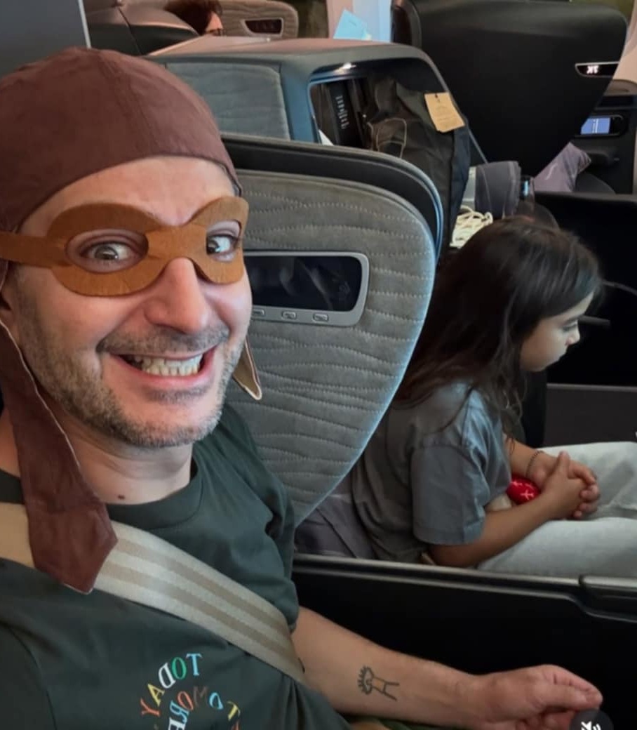Сашо, с маската на Зоро в самолета. Снимка: Instagram
