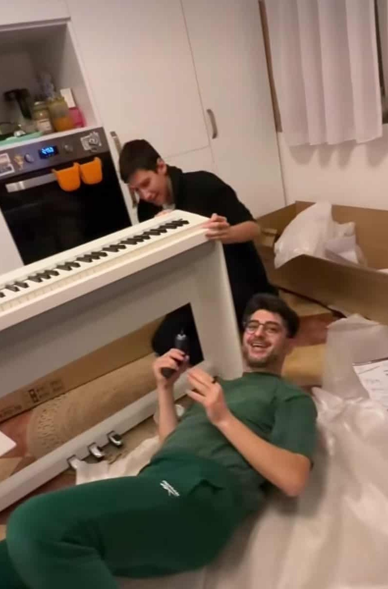 Сашо Кадиев сглобява новото пиано. Снимка: Instagram