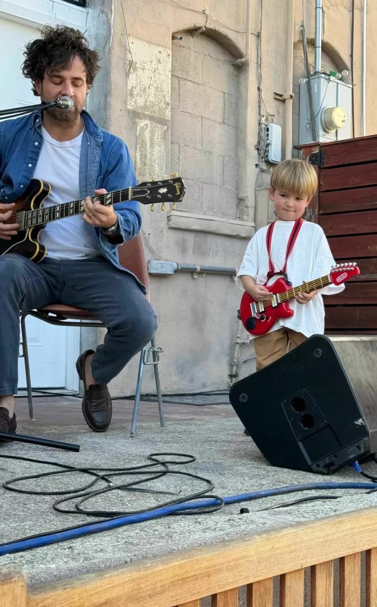 На кадрите се вижда Гюс, който държи детска китара и свири с известния си баща.