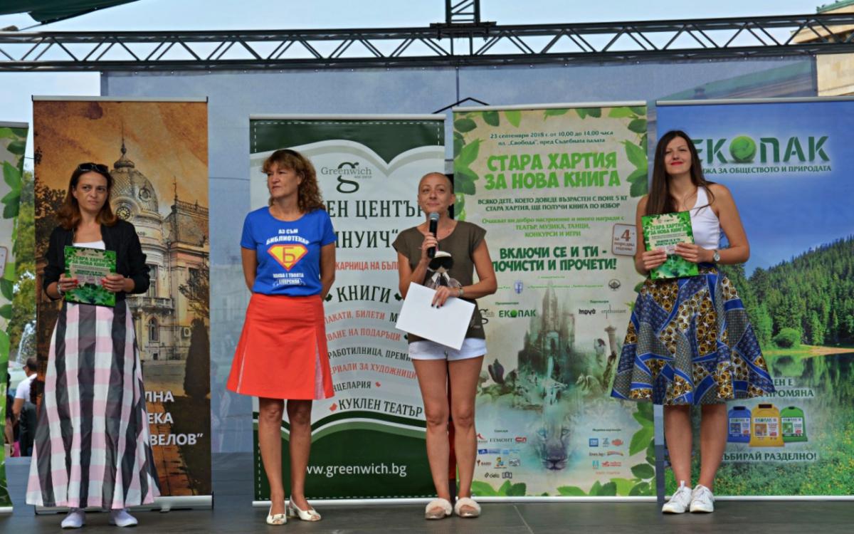 От ляво надясно: Мила Алексиева от „ЕКОПАК България“; Теодора Евтимова, директор на Регионална библиотека „Любен Каравелов“; Наталия Кръстева, заместник-кмет по комунални дейности; Сиана Колибарова от Книжен център „Гринуич“