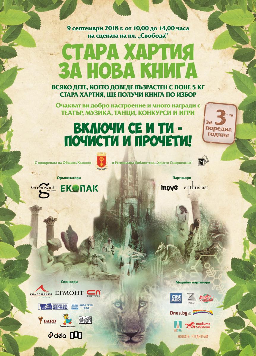 Националната инициатива „Стара хартия за нова книга“ гостува на Община Хасково за трета поредна година. Всички малки екоентусиасти могат да се включат в събитието на 9 септември на пл. „Свобода“ между 10,00 и 14,00 ч., като с помощта на възрастен придружител предадат 5 кг хартия за рециклиране.