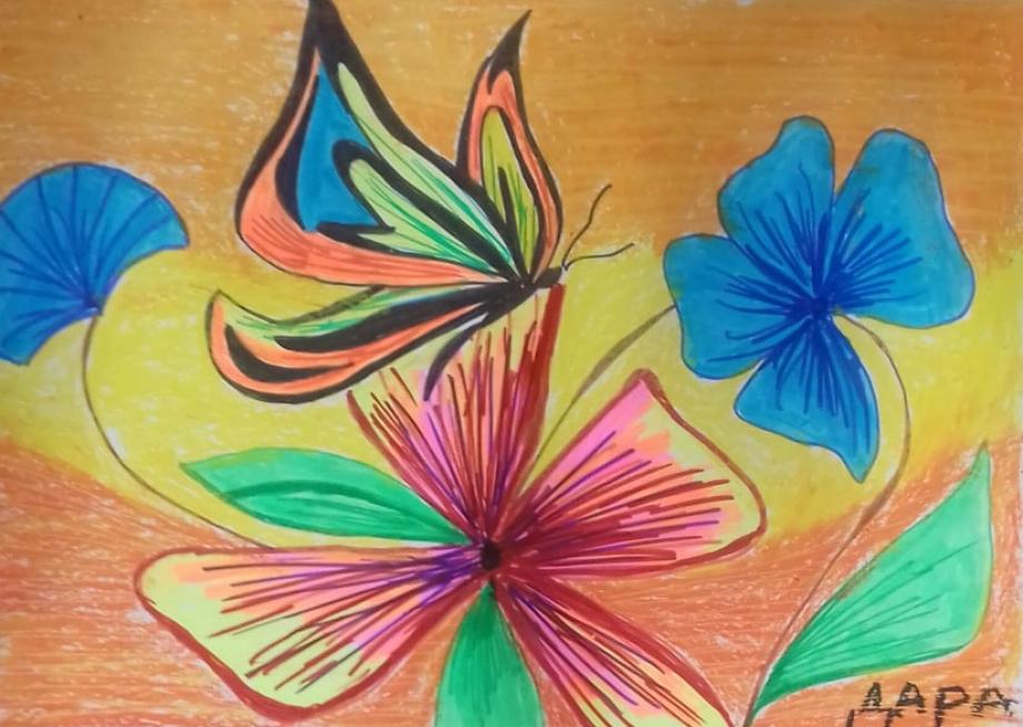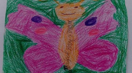 Дара е само на 4 години и 7 месеца, а вече рисува като голяма. Доказателство е тази творба „Пеперуда, кацнала на цвете“ , направена с флумастери и пастели.
