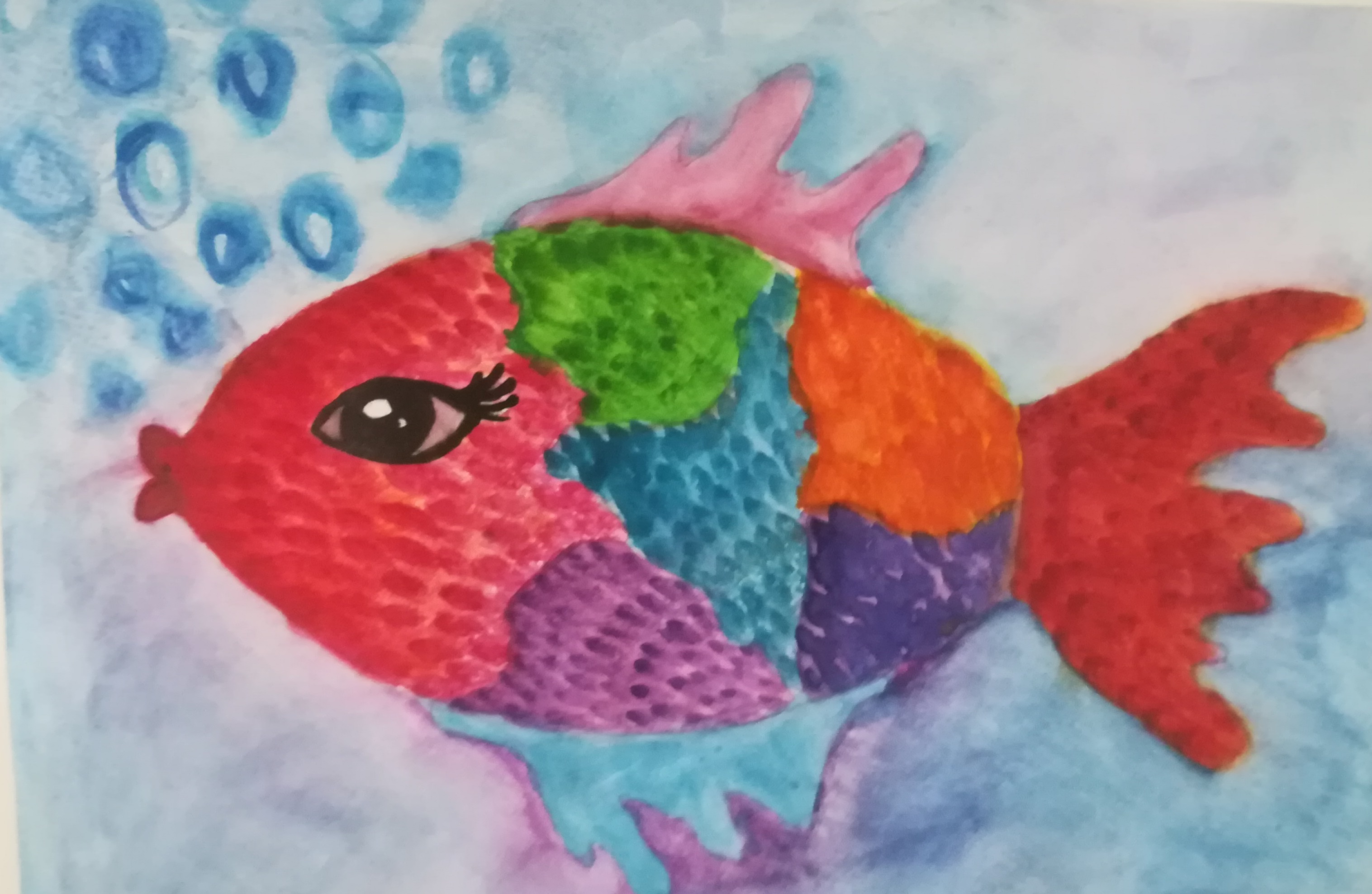 Екзотична риба в необичайни цветове е нарисувала Десислава. Рисунката ѝ е поставена на изложбата във фоайето на 73-о училище в София, където са изложени още много картини на талантливи ученици.