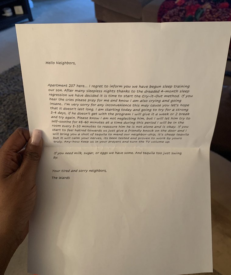 Апартамент 207 е на линия ... С тъга ви информираме, че започваме да учим сина си да спи. След много безсънни нощи и влошаване на положението със съня на бебето около 4-ия месец, решихме, че е време да преминем към метода „остави го да поплаче“. Ако го чуете да плаче, молете се за мен, защото знайте, че и аз в този момент аз също плача и полудявам ... Извинявам се предварително за всички неудобства, дано да не продължи дълго.