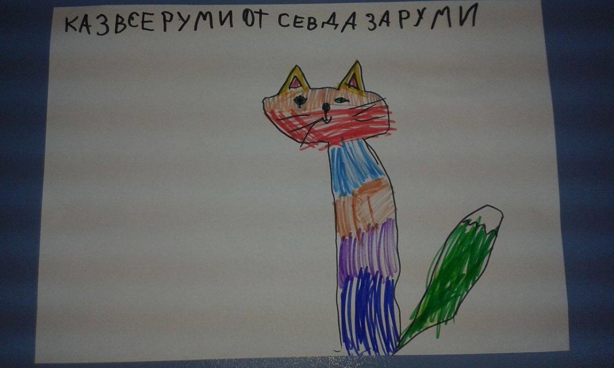 7-годишната Севда ни изпрати рисунка на шарено коте със зелена опашка . Картината е специален подарък за Руми. Вижда се от надписа.