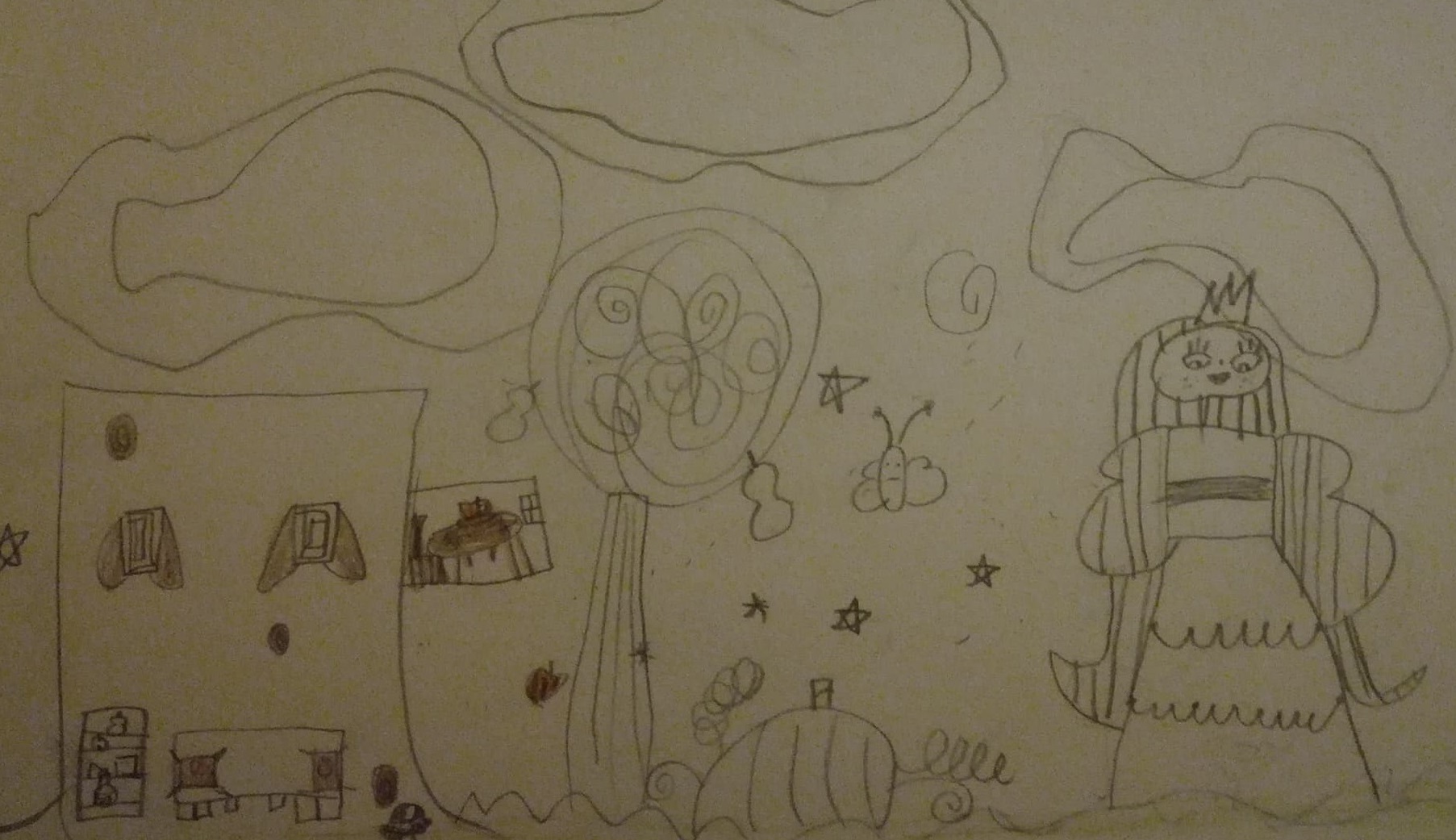 Дара е нарисувала една принцеса в нейната градина – дървета, отрупани с плод, пеперуди, пчелички, костенурка – всички са щастливи.