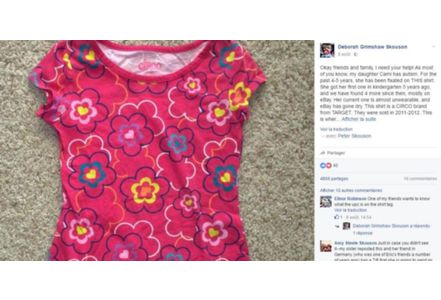 Преди броени дни на страницата си във фейсбук Дебора (Deborah Grimshaw Skouson) написа: „Както знаете, моята дъщеря Кеми е аутист. От 4-5 години тя е обсебена от една тениска – розова и на цветя“ и публикува снимка на тениската. „Тя я облече за първи път преди 5 години, още в детската градина. След това успях да купя чрез eBay още 4, но и те вече са се износили. А Кеми иска само нея."