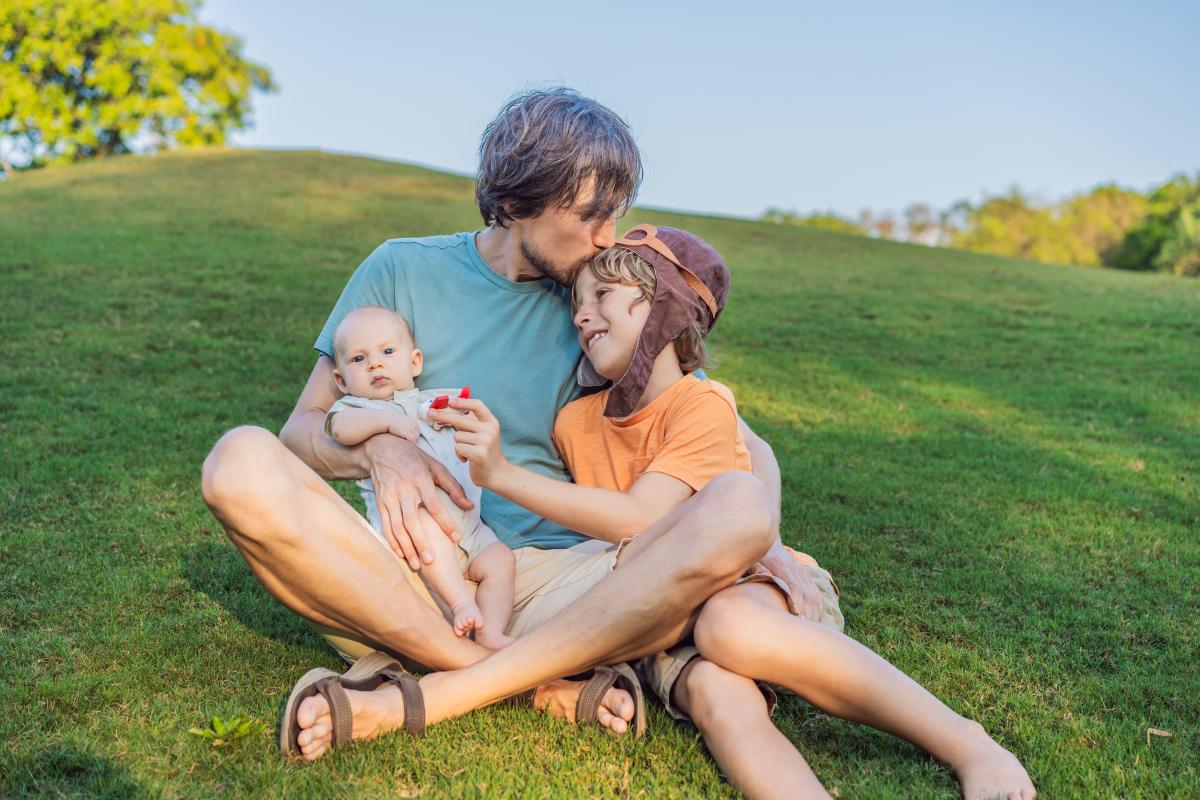 Баща, който гушка бебе и целува голямото си дете. Снимка: Shutterstock
