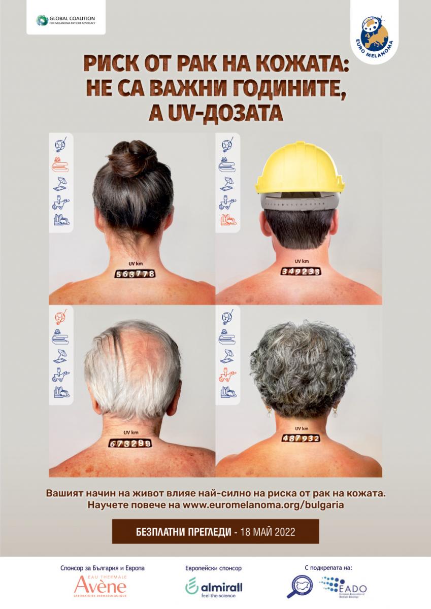 Кампания Евромеланома 2022 преминава под мотото: „Риск от рак на кожата: не са важни годините, а UV – дозата“. Акцентът е върху връзката между кумулативната доза ултравиолетова светлина, която всеки човек е натрупал, и неговия индивидуален риск от развирие на рак на кожата. Например едно младо момиче, което редовно е посещавало солариуми, може да има по-висок индивидуален риск от 60-годишен човек, който е избягвал умишленото излагане на слънце.