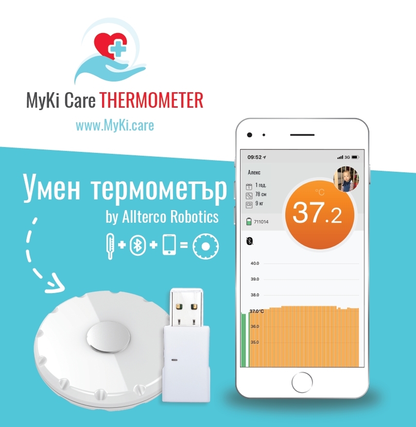 Алтерко Роботикс пуска в продажба умен термометър за деца MyKi Care. Иновативният продукт е първият по рода си на пазара и се отличава с изключителна точност от 0.01 градус, възможност за 24/7 дистанционно наблюдение на състоянието на детето през мобилно приложение, аларма на телефона при повишена температура и дори възможност за изпращане на информацията до педиатър.