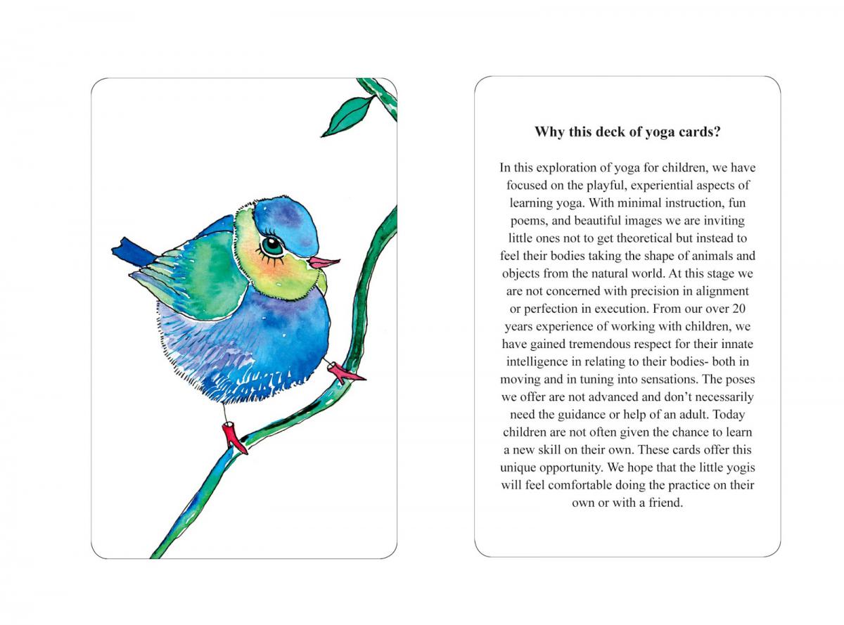 Красиво, забавно и вдъхновяващо тесте от 27 карти кара малките да се движат и смеят. Всяка карта е изобразена с оригинална илюстрация на йога поза и животното/ формата, която са я вдъхновили. Всяка карта съдържа и кратко очарователно стихотворение на английски.