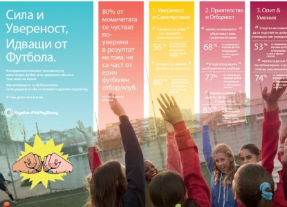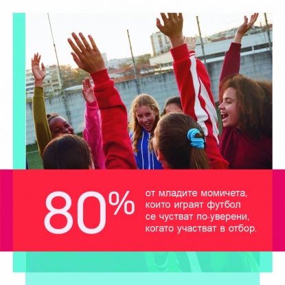 - 58% от анкетирани футболистки (13-17 години) заявяват, че са преодолели липсата на самоувереност, благодарение на футбола. При момичетата, практикуващи друг спорт, процентът е 51.