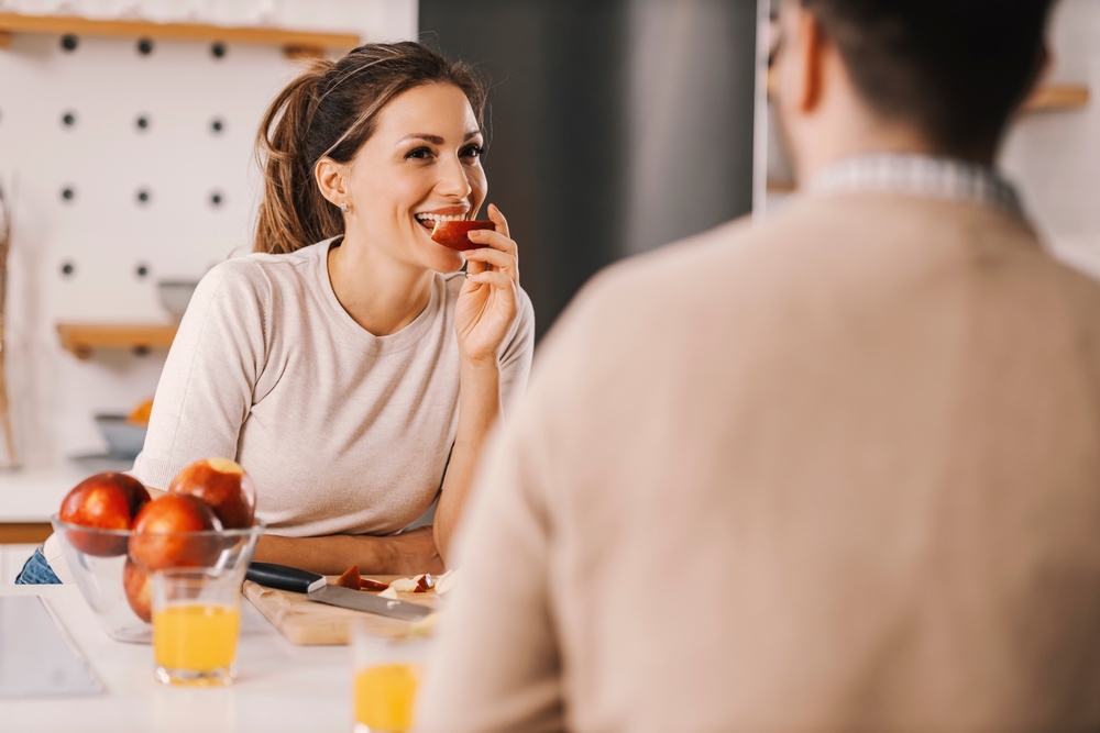 Мъж и жена закусват с плодов сок и ябълки. Снимка: Shutterstock