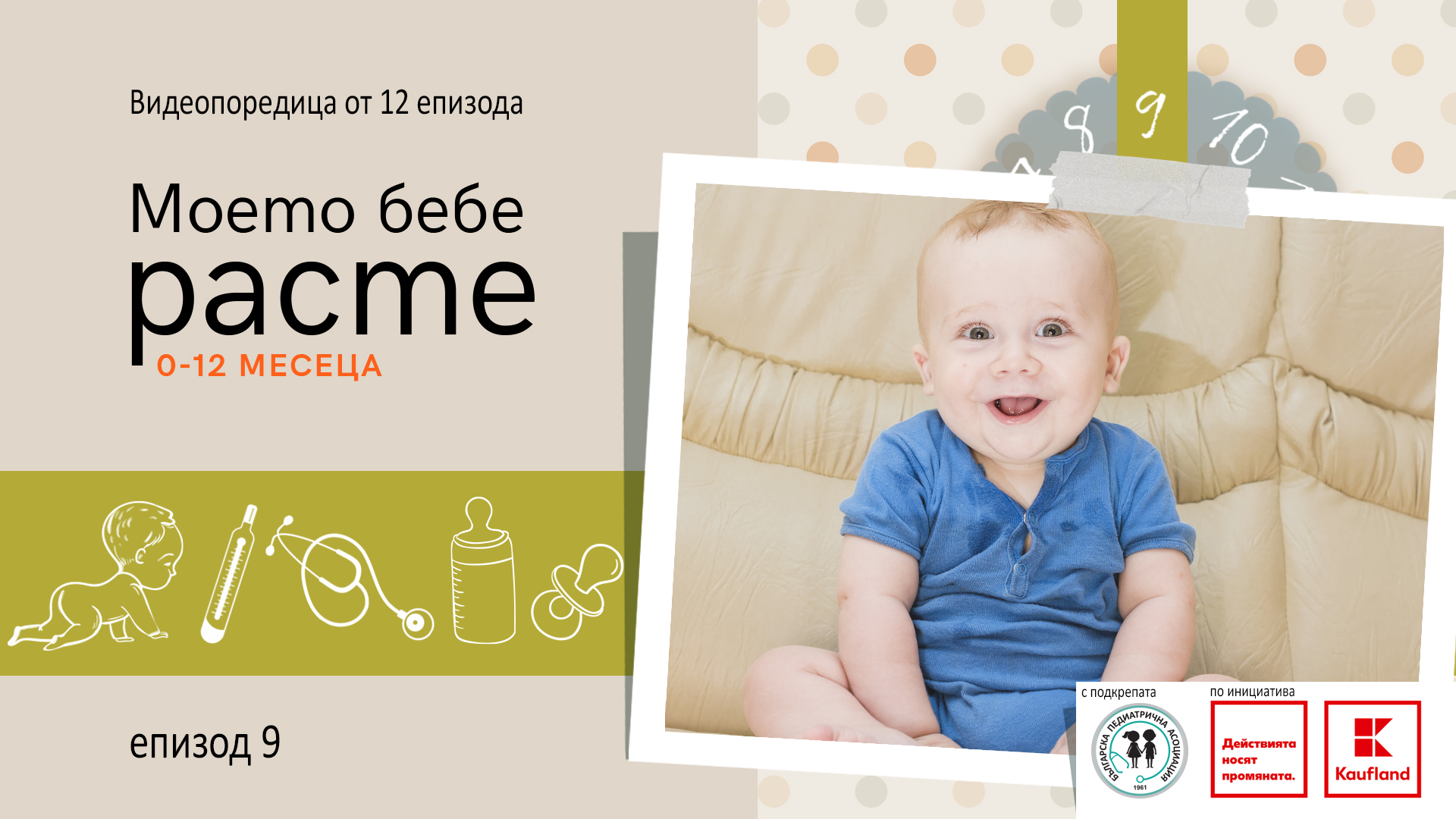 Бебето на девет месеца развива първите си социални умения, затова трябва да му се осигуряват възможно най-много контакти с външната среда и хора. Това споделят специалистите в новия епизод от съвместната видеопоредица на Kaufland България и Българската педиатрична асоциация „Моето бебе расте“, който вече е достъпен онлайн. Видеото е посветено на деветия месец от живота на бебето и разказва за важните процеси от неговото развитие. В епизода се включват педиатрите д-р Андрей Гончаров и д-р Мила Байчева, които дават ценни съвети за дневния режим и хранене на новите родители, заедно с проф. Иван Литвиненко - един от водещите специалисти по детска неврология в страната и югоизточна Европа.