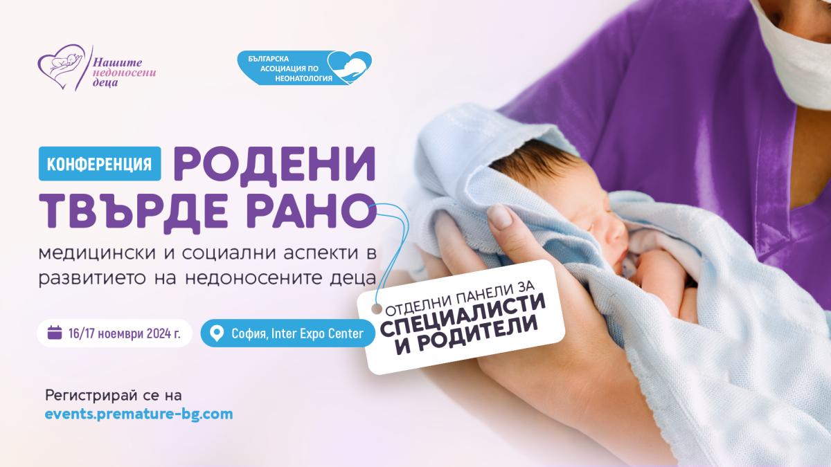 Конференцията „Родени твърде рано: медицински и социални аспекти от развитието на недоносените деца“ ще се проведе за четвърти пореден път на 16 и 17 ноември 2024 г. в Inter Expo Center - София с възможност за участие и онлайн, и ще събере на едно място известни специалисти от страната и чужбина, професионалисти, експерти и родители. По време на събитието те могат да обменят ценни знания, информация и опит, Конференцията се организира за четвърти пореден път през месец ноември и по случай Световния ден на недоносените деца - 17 ноември, от Фондация „Нашите недоносени деца“. Създадена от 3 майки на недоносени деца, Фондацията е единствената неправителствена организация в България, която работи вече над 12 години в подкрепа на най-малките герои и техните семейства.