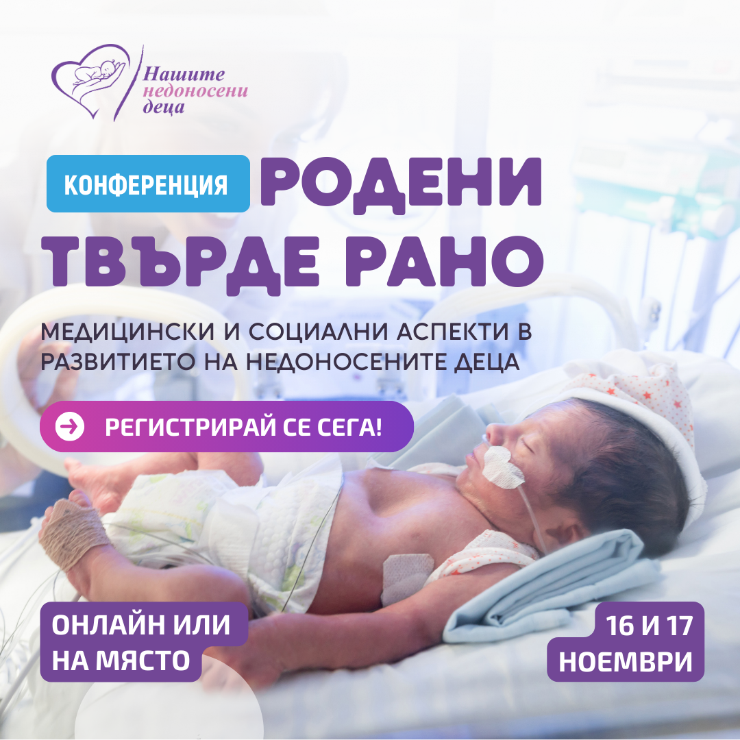 Конференцията „Родени твърде рано - медицински и социални аспекти на развитието на недоносените деца“ е единствения по рода и мащаба си форум в България, посветен на темата за преждевременното раждане и недоносените деца. Тя ще се проведе за четвърти пореден път на 16 и 17 ноември 2024 г. в Inter Expo Center - София с възможност за участие и онлайн, и ще събере на едно място известни специалисти от страната и чужбина, професионалисти, експерти и родители. По време на събитието те могат да обменят ценни знания, информация и опит, свързани с раждането на недоносено дете и възможностите всеки малък герой да получи най-добра грижа и бъдеще. Конференцията „Родени твърде рано“ се организира за четвърти пореден път през месец ноември и по случай Световния ден на недоносените деца - 17 ноември, от Фондация „Нашите недоносени деца“. Създадена от 3 майки на недоносени деца, Фондацията е единствената неправителствена организация в България, която работи вече над 12 години в подкрепа на най-малките герои и техните семейства.