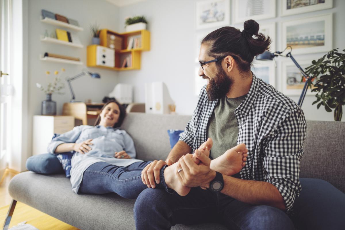 Мъж масажира краката на бременната си жена. Снимка: Getty