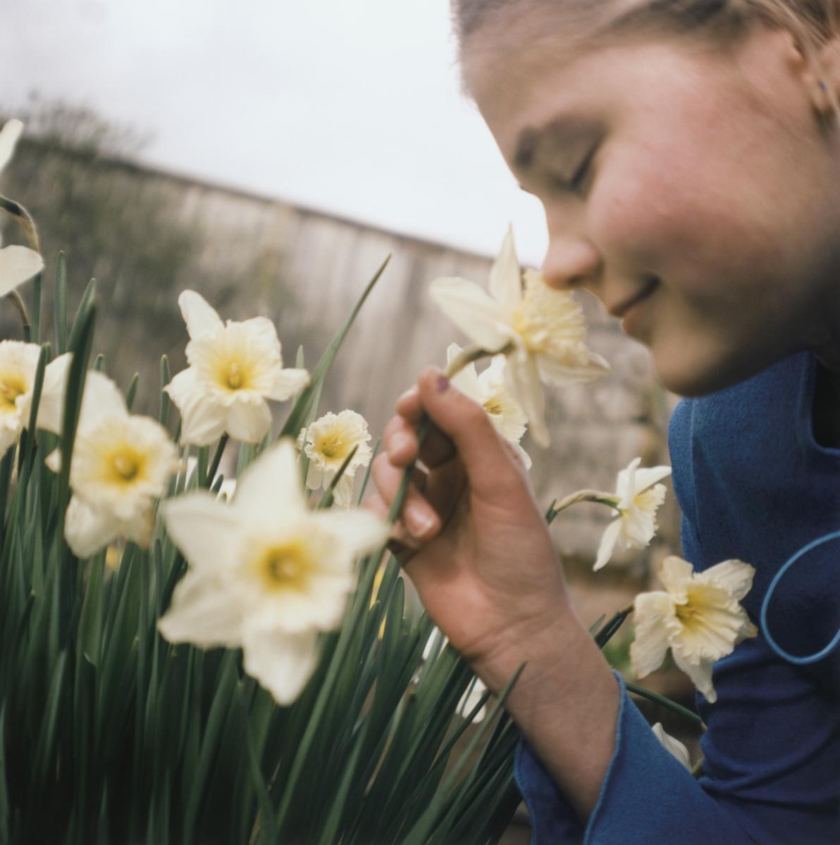 Дете се радва на нарцисите в градината. Снимка: Getty